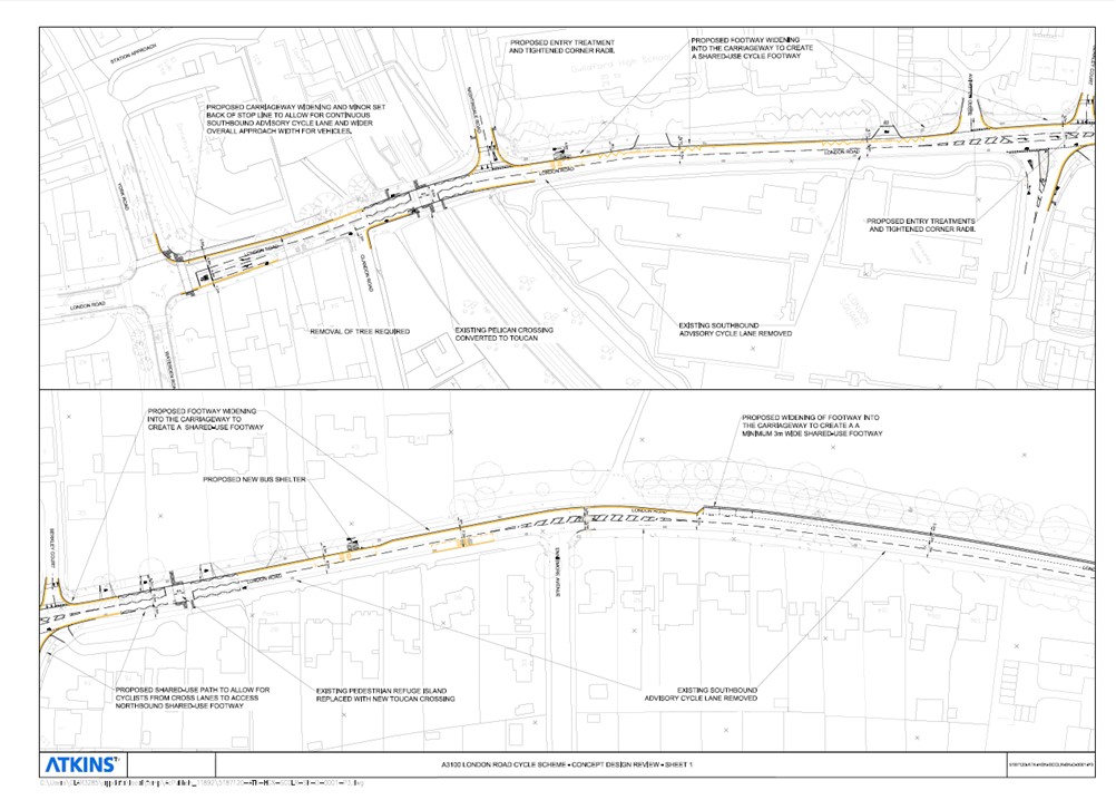Highways England have sent the latest plans for the upgraded M25/A3 Wisley Interchange. Of particular interest, the plans show the proposed route for the cycle track (more precisely, the track for ‘Non-Motorised Users’, NMU) beside the A3 from the Cobham/Painshill junction across a new dedicated bridge over the M25 to the Ockham Park junction. Less…